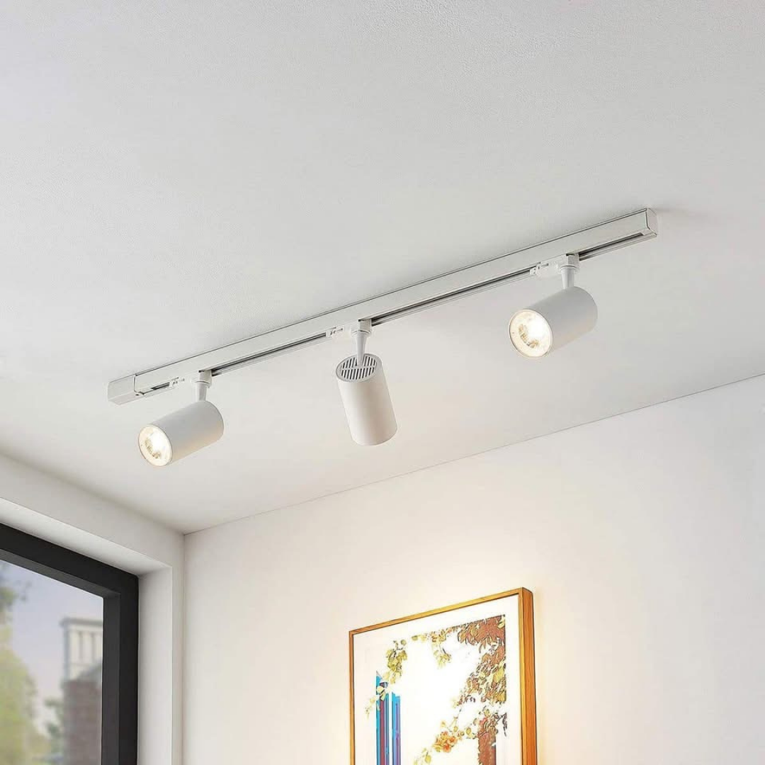 Système de lampes sur rail monophasé pratique en acier et aluminium au design épuré est un compagnon moderne et pratique lorsqu'il s'agit d'éclairer l'intérieur. Il s'agit d'un système de lampes sur rail d'un noir élégant. L'ensemble comprend trois spots de forme cylindrique qui sont équipés des ampoules correspondantes. Cette forme d'abat-jour assure un éclairage ciblé et non éblouissant dans la pièce à vivre.
